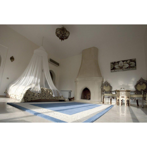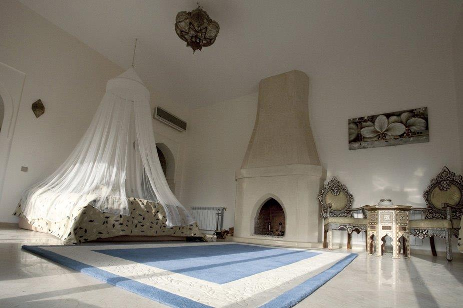 La villa dans un esprit architectural traditionnel faisant appel aux matériaux des palais contemporains de la Palmeraie : Bois sculpté, brique, Tadelakt et profusion de marbre dans les salles de bain.