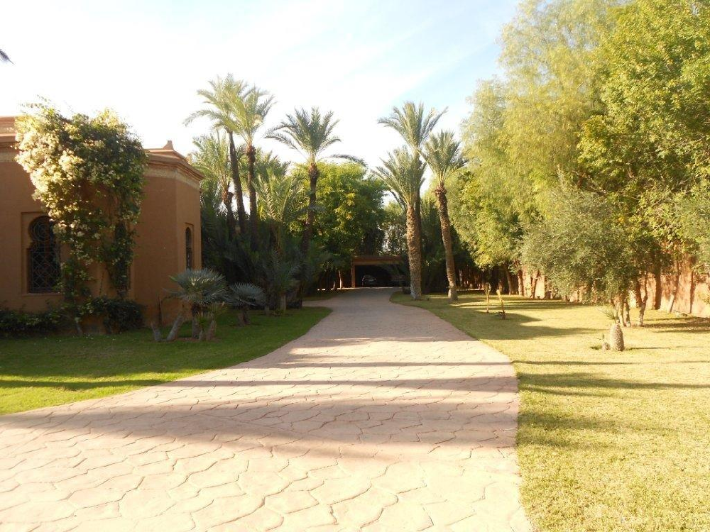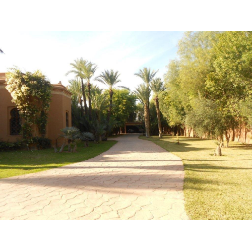 Superficie terrain 1ha Emplacement triangle d or palmeraie Surface habitable 800 m² + 600 étage RC double salon réception séjour salon marocain avec plafond en bois Deux suites sdb dressing